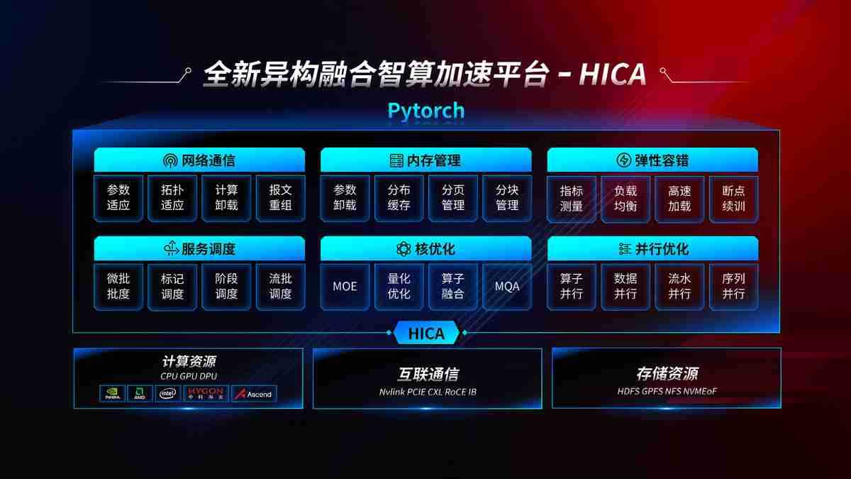 通过自研的服务层、、、、中间适配层、、以及调度编排算法,,,,采用数据并行、、模型并行等多种并行方式,,,,把并行计算任务进行有效的分解,,,,使其分别由相应的软件栈和算力资源来承接。。。当GPU资源变化,,,,HICA可以实时动态调度计算子任务并调整模型拓扑和架构,,,以充分聚合各种算力资源。。。。