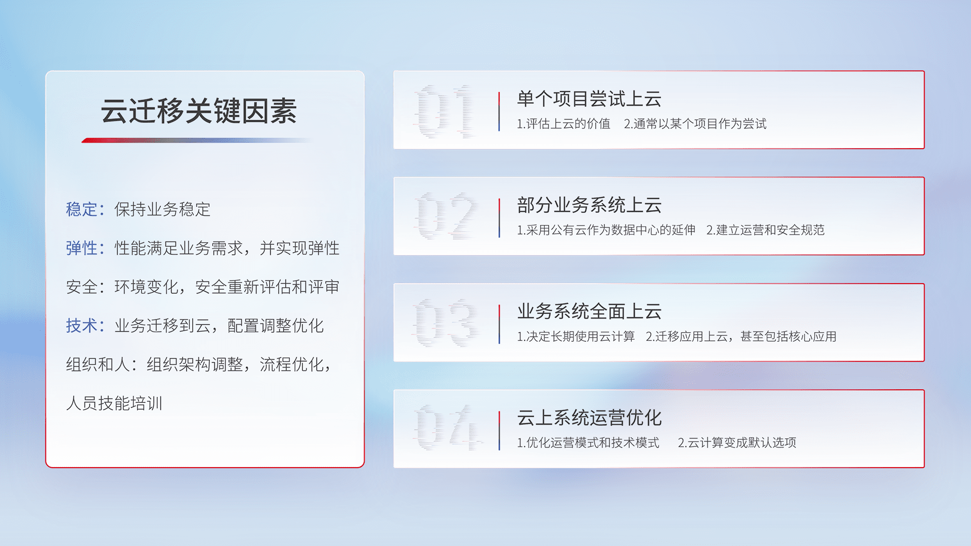 结合实际业务,,从规划设计、、、云平台选型、、、云原生改造、、数据迁移、、集成交付,,迁移全过程为客户识别最佳上云路径,,,,做好风险识别管理,,,,设计网络架构、、身份权限、、安全审计合规、、、、操作审计、、、日志审计、、监控告警策略、、、、多站点容灾设计等,,对云上基础设施进行整体规划,,提升IT治理水平,,以满足弹性、、高可用、、、、高性能的需求。。。