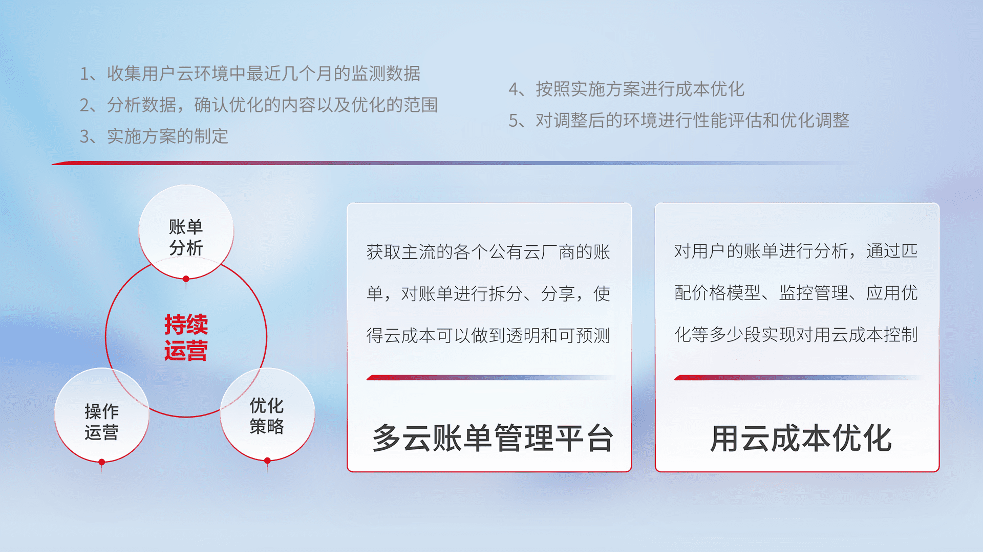 通过灵活运用多种自动化迁移工具,,帮助企业用户实现业务和数据高效 、、、、稳定的上云迁移和云上迁移,,,,采用自研多云纳管平台,,以中立管理模式,,,解决多组织、、、、多云、、、多运维厂商的复杂关系的管理,,,保证多云平台资源配置的一致性,,实时掌控云资源运行数据,,,运用智能化工具分析云资源多云平台的管理服务,,,,透明化管理成本支出,,,用云成本可预测、、、、用云费用可优化、、、云资源配额有据可依。。。。