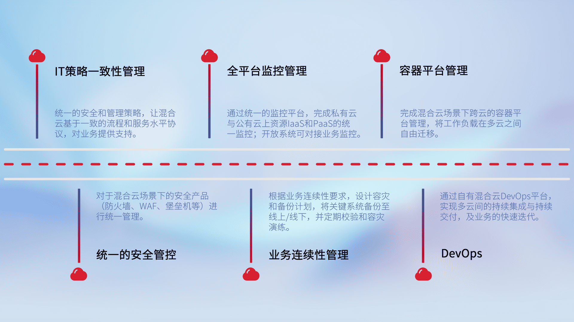 通过多云纳管,,以统一的资源数据模型把客户的云资源进行抽象和封装,,进而实现对多云资源的统一操作,,保障云资源管理的可靠性、、稳定性与可用性。。。量身定制化运维内容,,,配置、、、、开发运维、、、、补丁管理、、备份、、、、监控、、、认证和访问管理、、、审计和日常巡检等,,,,保障在用云过程中的可靠度,,,稳定度以及高可用率。。