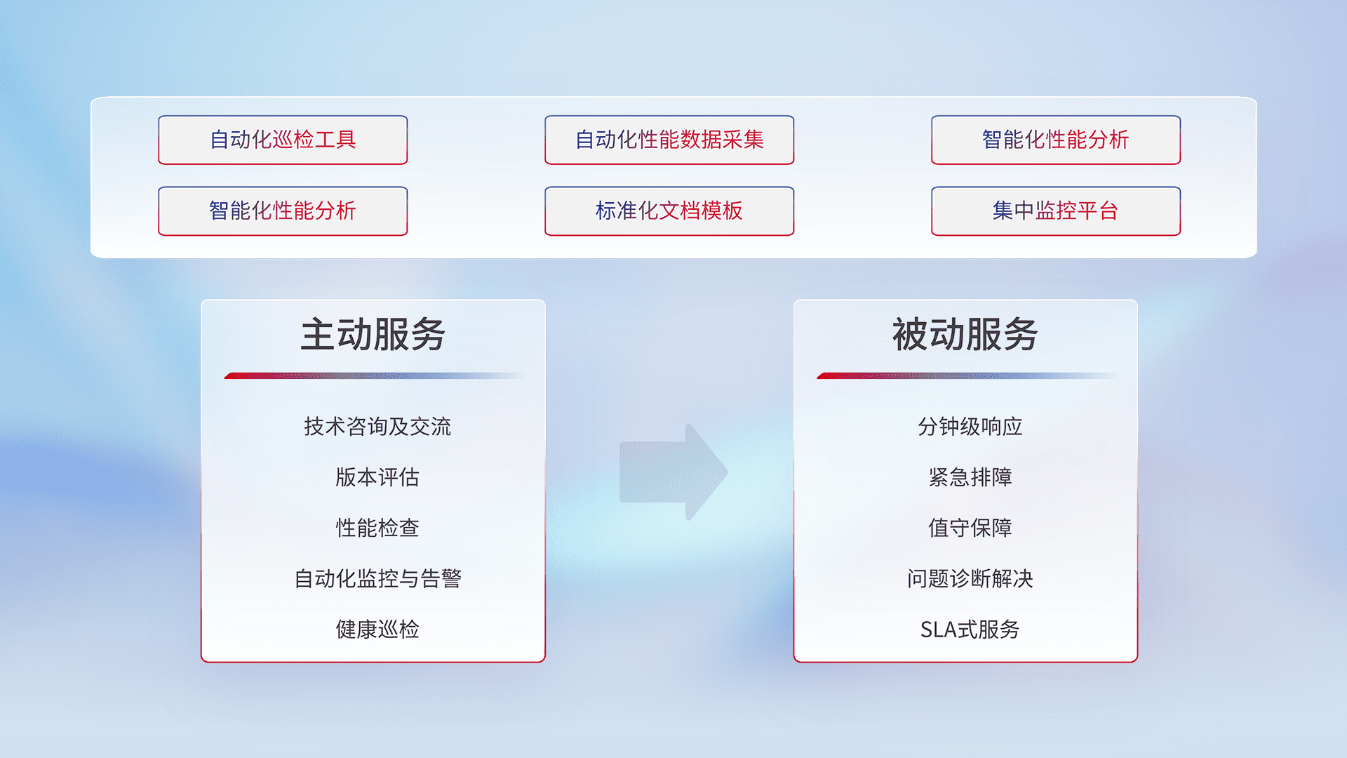 智能化工具和标准化文档,,保障服务质量,,,,提供主动服务(包含技术咨询、、、、版本评估、、、、性能检查、、、自动化监控与告警、、、健康巡检)和被动服务包含(分钟级响应、、、紧急排障、、值守保障、、、、问题诊断解决、、、、SLA服务)。。